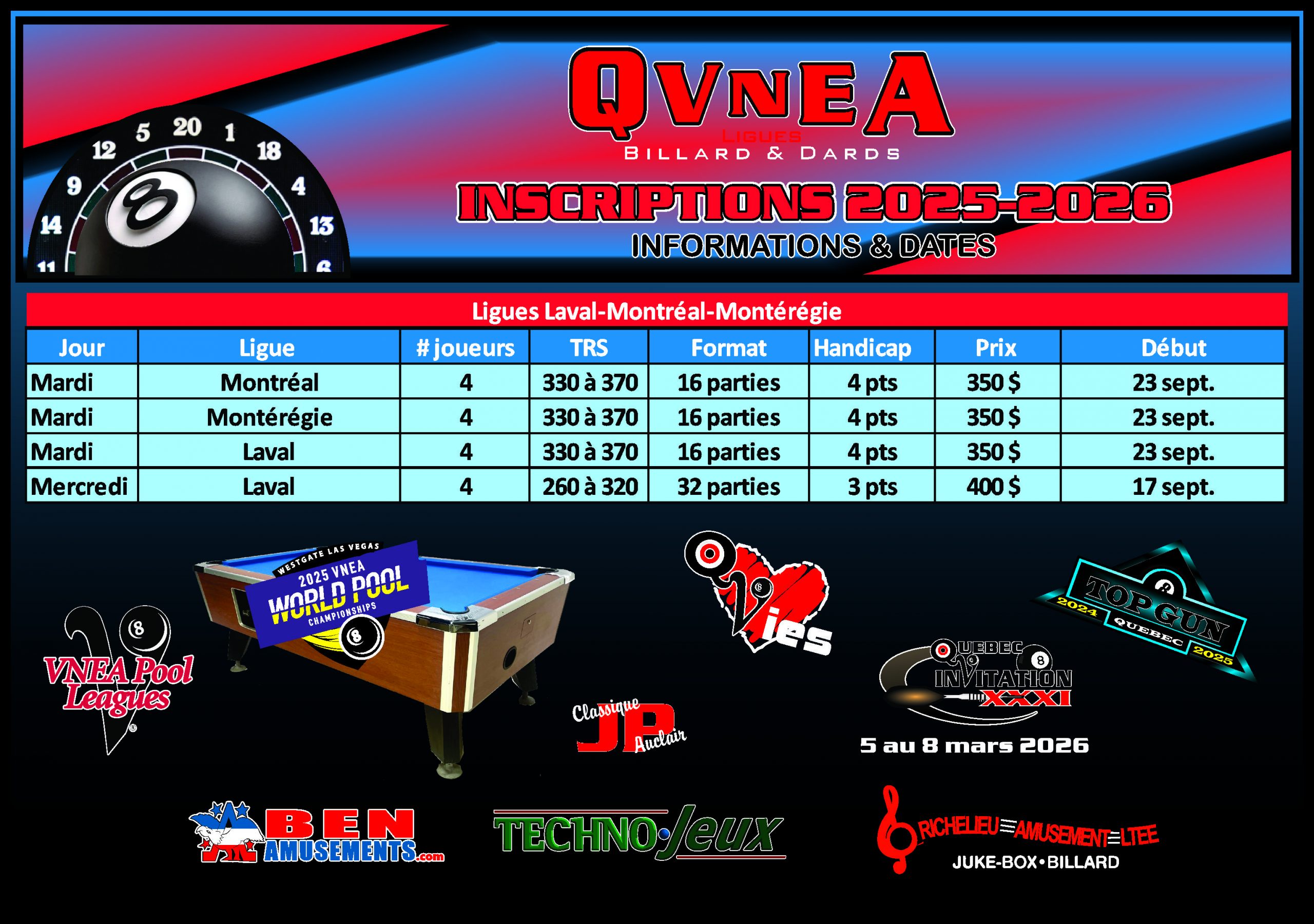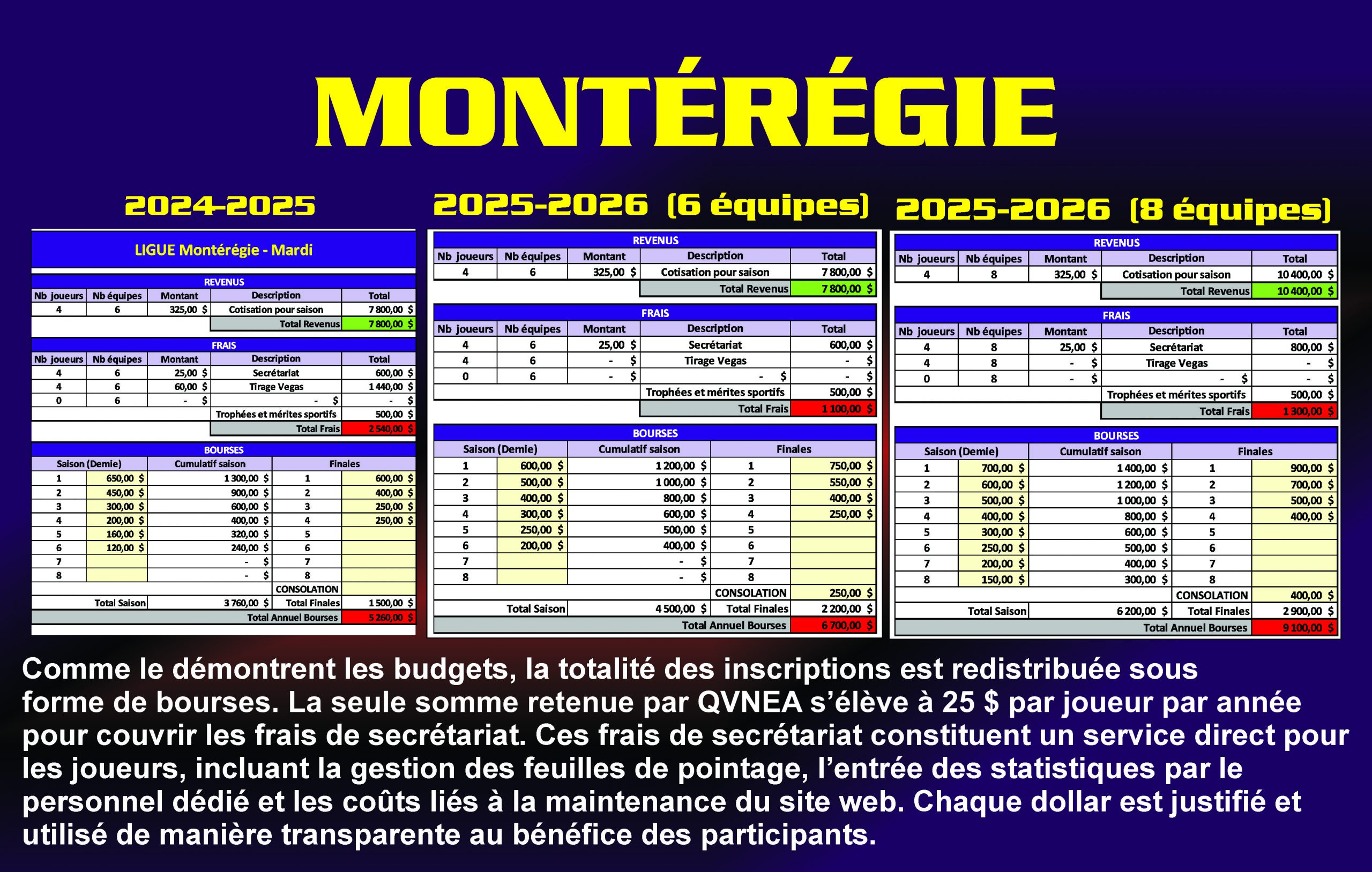 Comme depuis plus de 30 ans (dont 8 ans sous la bannière QVNEA), une ligue aura lieu le mardi soir en Montérégie. Selon les inscriptions, 6 à 8 équipes participeront. Lors de la dernière réunion, les joueurs ont décidé de ne plus cotiser pour un voyage à Las Vegas, préférant réallouer ces fonds aux bourses locales. Nous présentons ci-dessous le budget de l’année passée, ainsi qu’une version alternative si les fonds du voyage avaient été intégrés aux bourses (calcul basé sur 8 équipes).