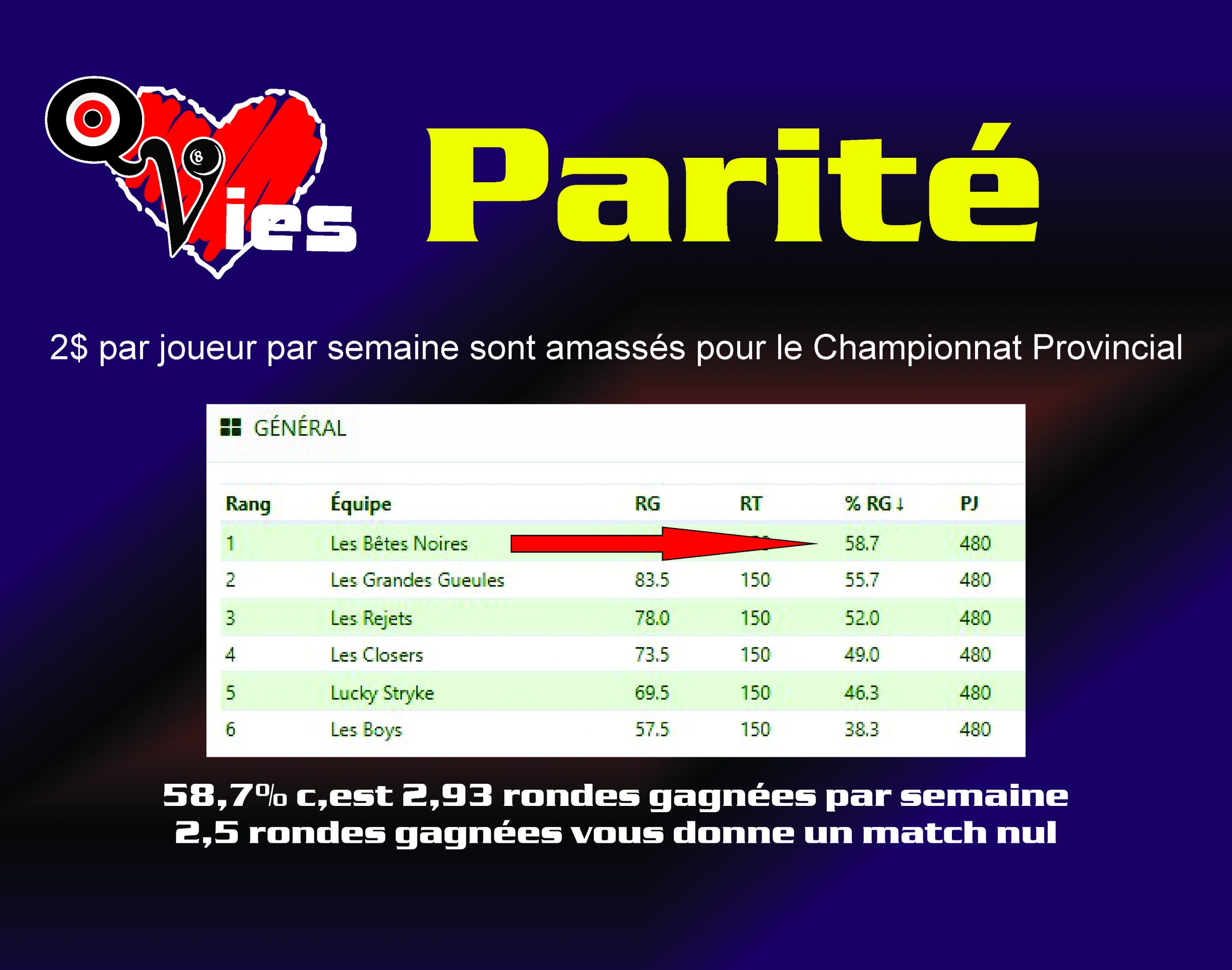 QVNEA vous propose les ligues les plus compétitives au Québec ! Découvrez l’exemple de la ligue Montérégie : L’équipe en première position affiche une moyenne de rondes gagnées de 58,7 %. À titre de comparaison, une victoire par un score de 3 à 2 équivaut à 60 % de rondes gagnées. Ainsi, même la meilleure équipe de la ligue se situe légèrement en deçà de ce seuil. Pour information, un match nul correspond à une moyenne de 2,5 rondes gagnées.