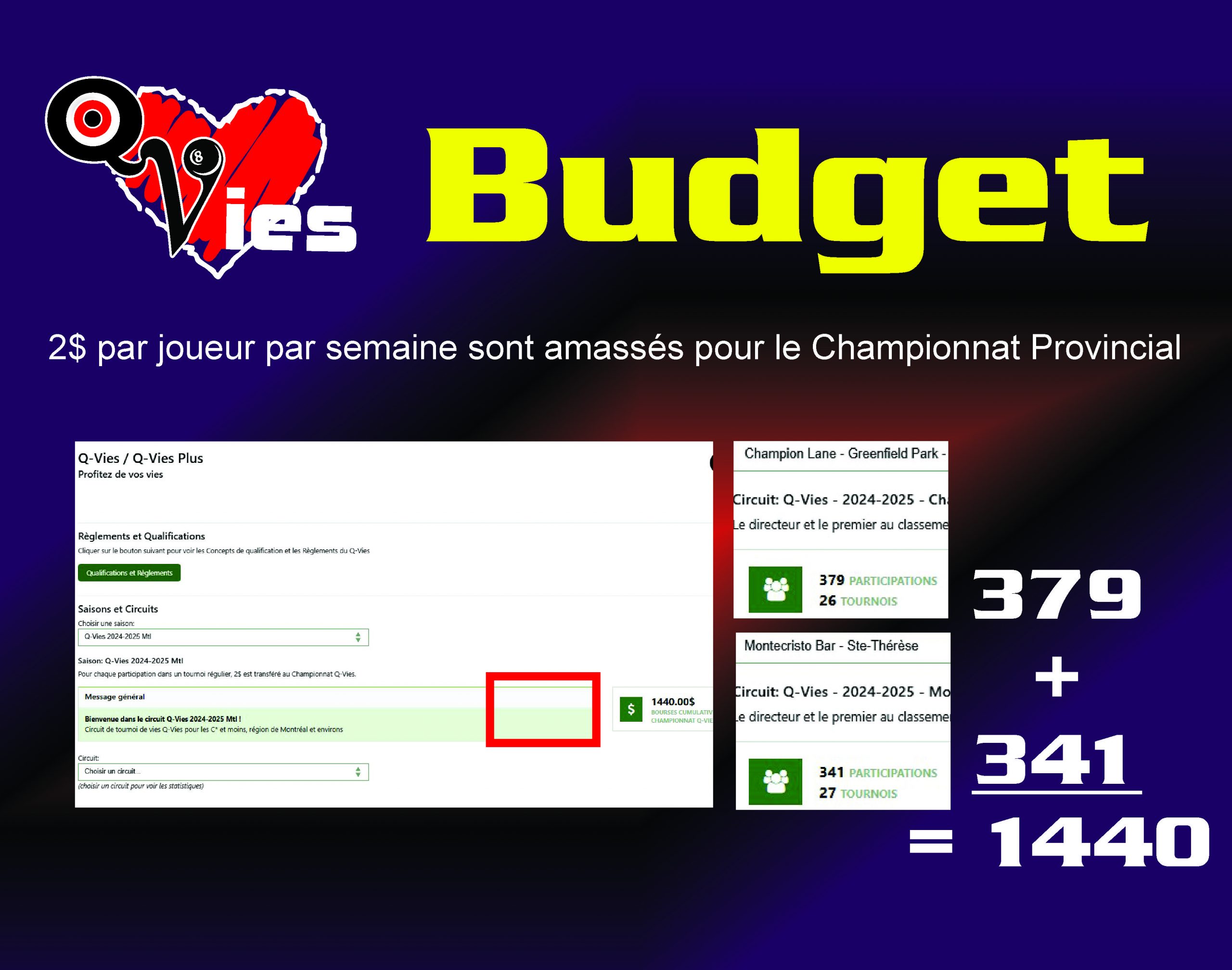Les tournois Q-Vies sont facilement vérifiables via statelo.com, qui affiche les montants retenus pour le Championnat Provincial. Chaque semaine, les directeurs redirigent 2 $ des frais d’inscription vers la bourse du championnat. Actuellement, 720 participations ont permis d’accumuler 1440 $ (720 × 2 $). Ces informations sont publiques et accessibles