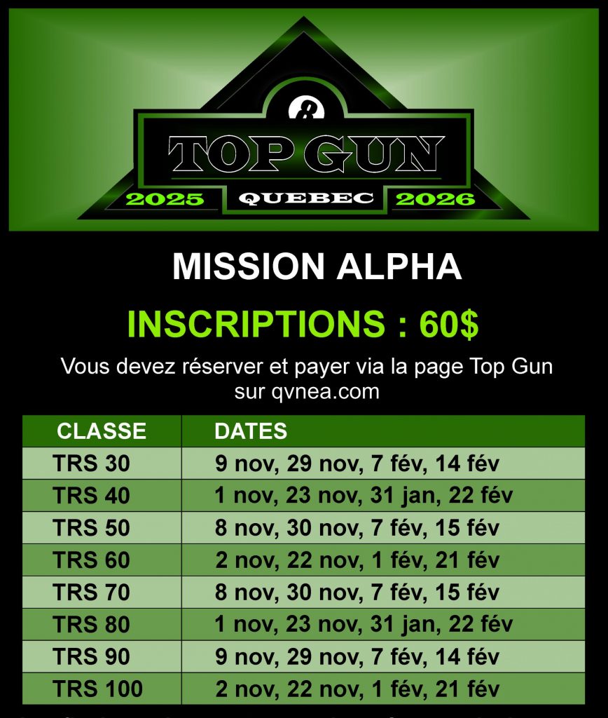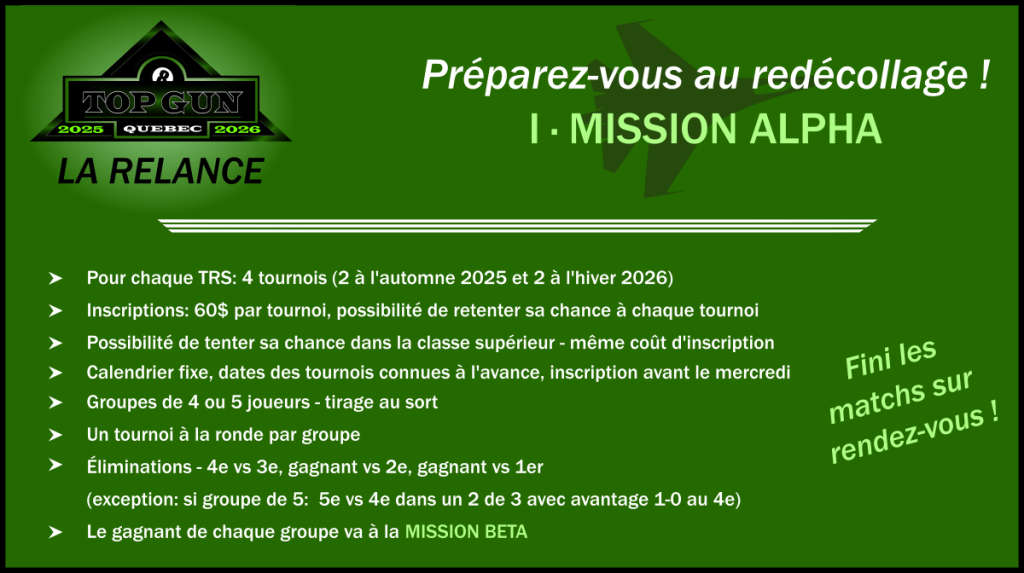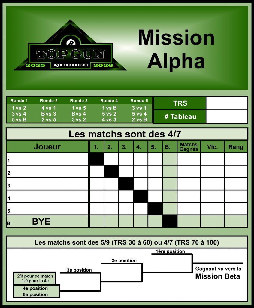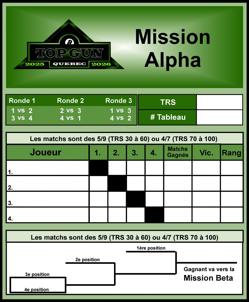 La Mission Alpha est la première étape du Top Gun. Chaque classe comporte quatre tournois Alpha dans l’année, et un joueur peut tenter sa chance à chacun d’eux. Les participants inscrits sont répartis en plusieurs groupes de 4 ou 5 joueurs et disputent un tournoi à la ronde à l’intérieur de leur groupe. Les matchs sont des 5 de 9 ou des 4 de 7 (selon le TRS et la grosseur du groupe). À la fin de cette ronde, un classement est établi et on passe aux éliminatoires (format 5 de 9 ou 4 de 7, selon le TRS).