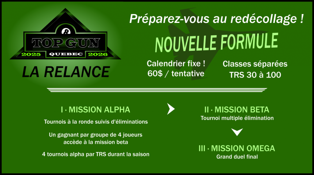Préparez-vous à redécoller avec une formule repensée, plus dynamique et plus excitante que jamais. Fini les matchs à organiser sur rendez-vous : un calendrier fixe assure rythme et clarté pour tous les joueurs. Avec des classes séparées (TRS 30 à 100), l’objectif est simple et motivant : couronner le meilleur joueur de la région dans chaque TRS. Que vous participiez pour le défi, pour l’adrénaline ou pour les bourses en jeu, le Top Gun nouvelle génération promet une compétition relevée et une expérience mémorable tout au long de la saison 2025-2026.