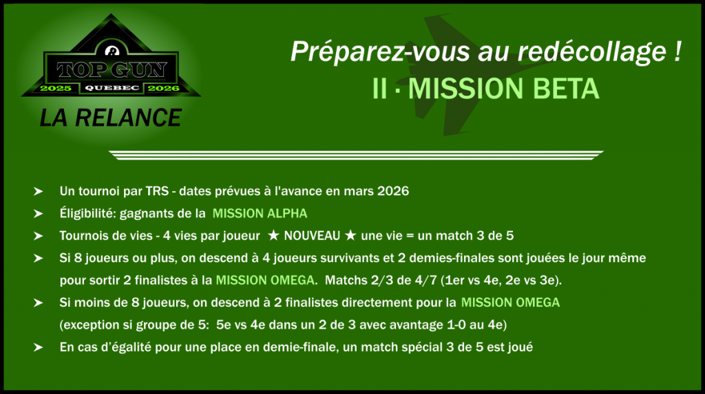 Évidemment, une fois qualifié pour la Mission Beta pour un TRS, vous ne pouvez plus participer à ces tournois pour ce TRS. C’est le temps de tenter votre chance dans le TRS supérieur (même prix, même concept).