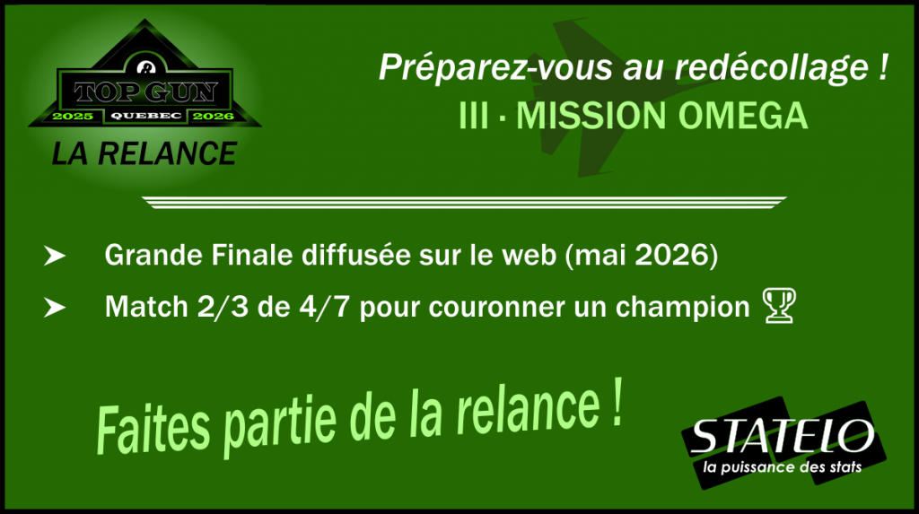 La Mission Omega est la grande finale du Top Gun. Elle se jouera en semaine, au mois de mai, au Dooly’s Neufchâtel, et sera diffusée en direct sur le web.